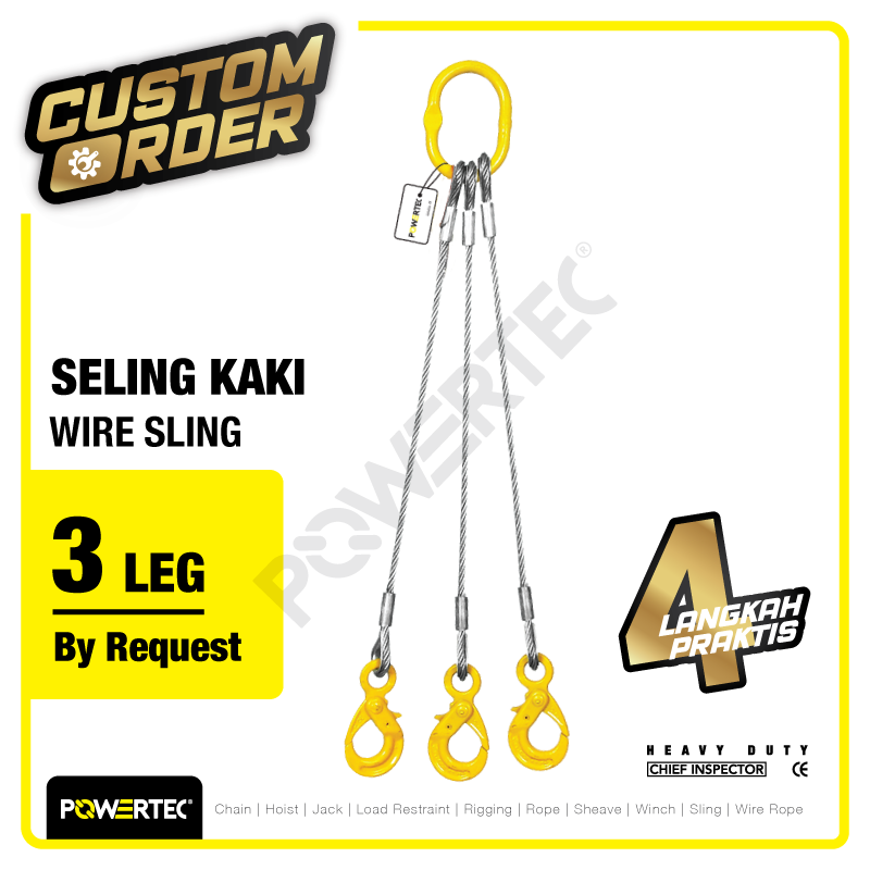 POWERTEC® merupakan distributor yang menyediakan Three Legs Wire Rope Sling atau Custom Seling Press Wire Sling 3 Kaki beragam ukuran paling lengkap yaitu